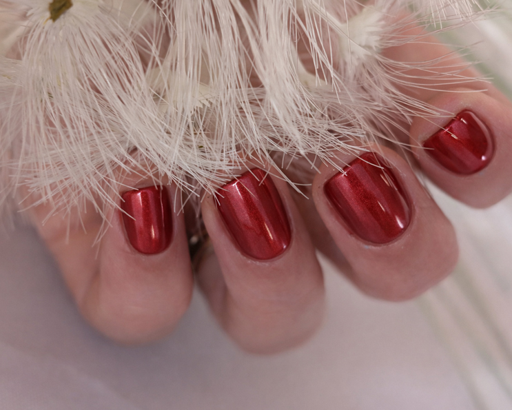 Un choix parfait pour celles qui aiment les vernis rouges sophistiqués avec une touche glamour métallique.