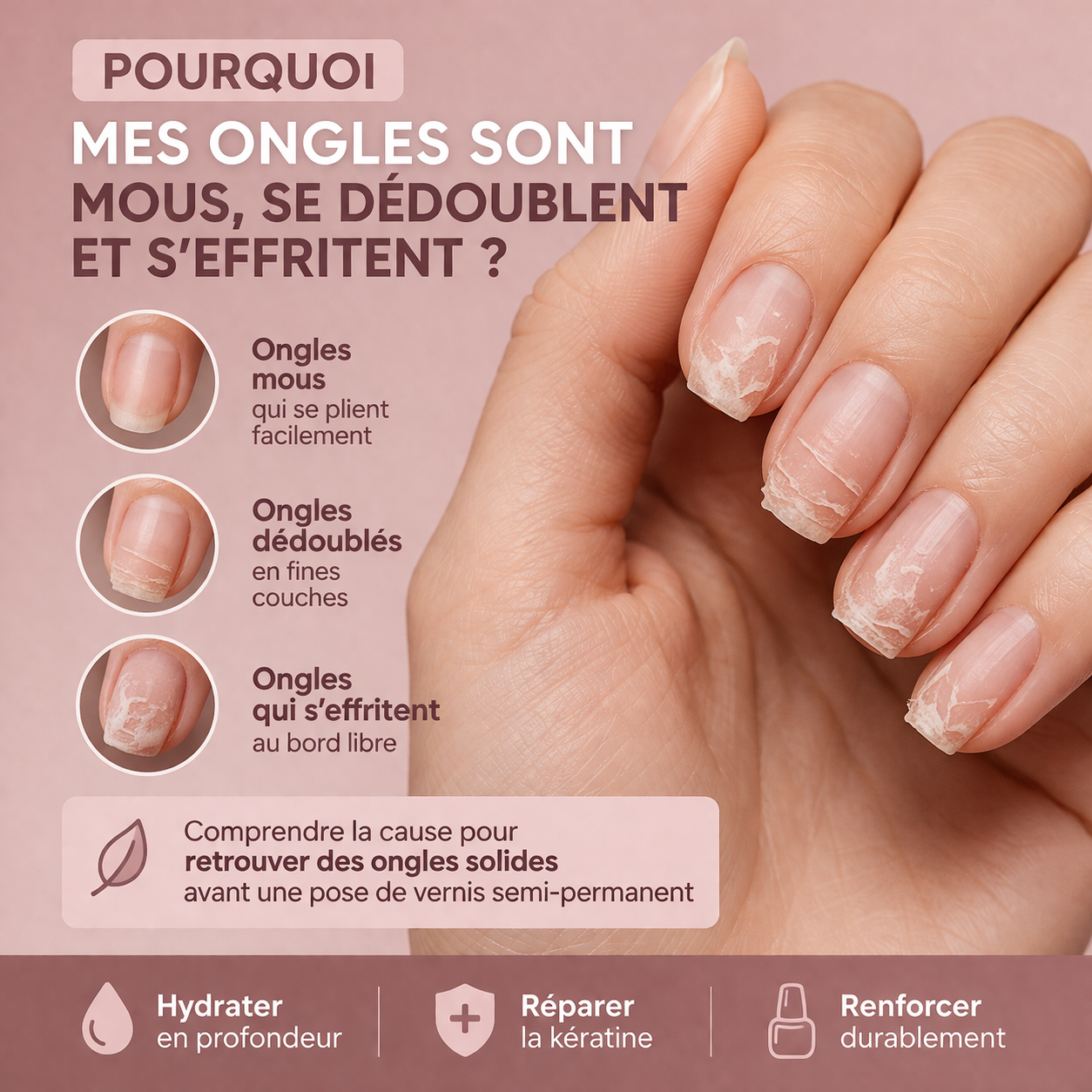 Des ongles mous, qui se dédoublent ou s’effritent nécessitent une approche complète : 👉 réparer la kératine 👉 hydrater en profondeur 👉 renforcer durablement