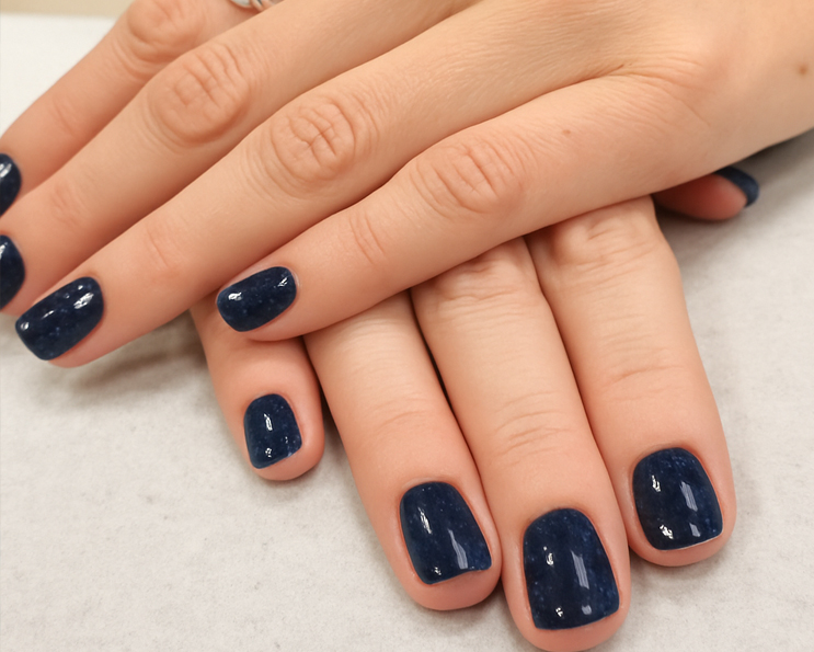 Bleu nuit intense, presque noir, subtilement illuminé de micropaillettes bleu saphir et argentées.