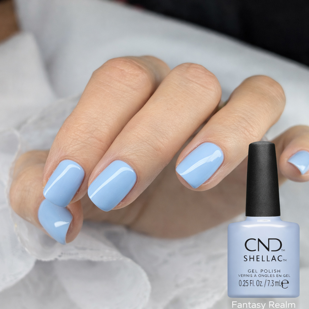 Le CND™ Shellac Fantasy Realm est un vernis semi-permanent professionnel à la teinte bleu pastel tendre et légèrement nacrée,
