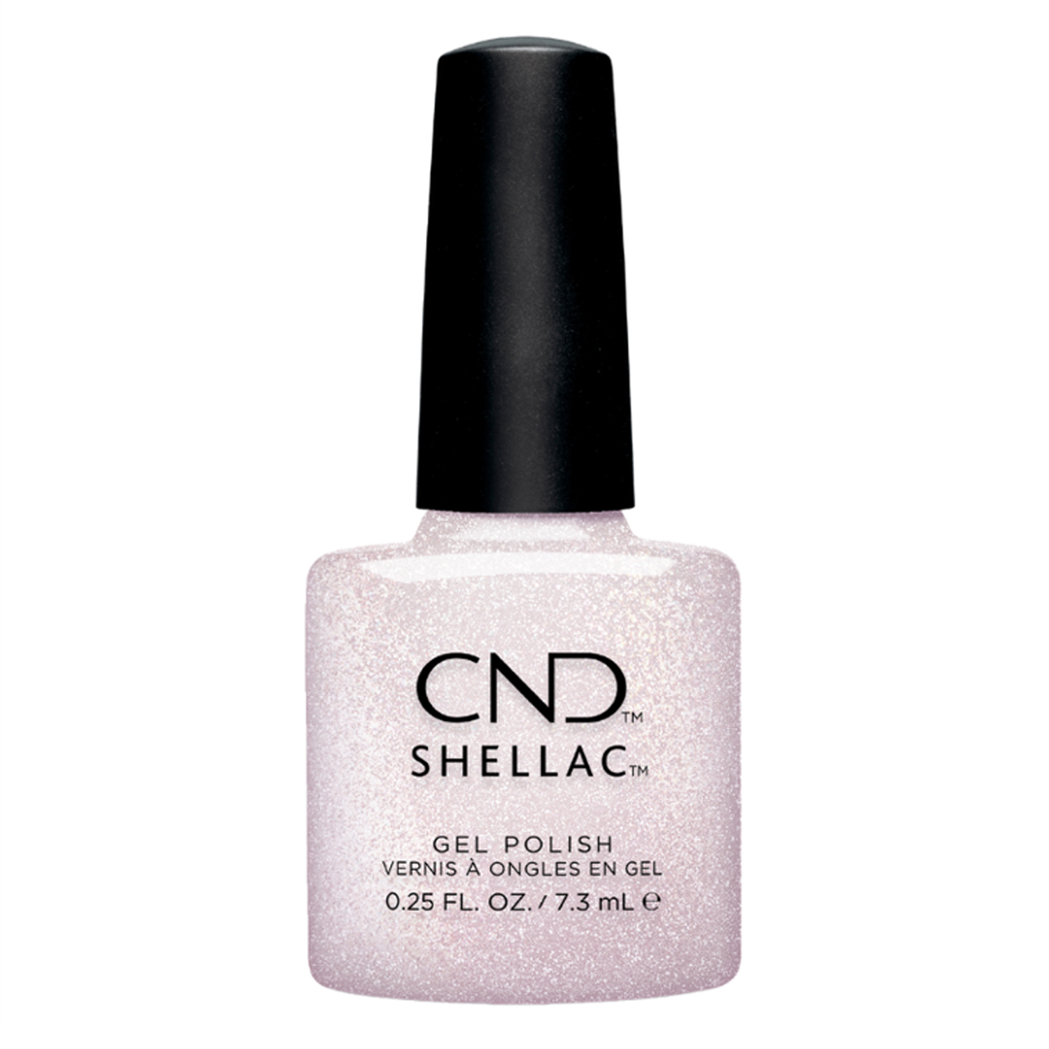 Le vernis semi-permanent professionnel CND™ Shellac Night Brilliance dévoile un blanc argenté scintillant à reflets nacrés.