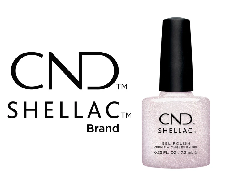 Le vernis semi-permanent professionnel CND™ Shellac Night Brilliance dévoile un blanc argenté scintillant à reflets nacrés.