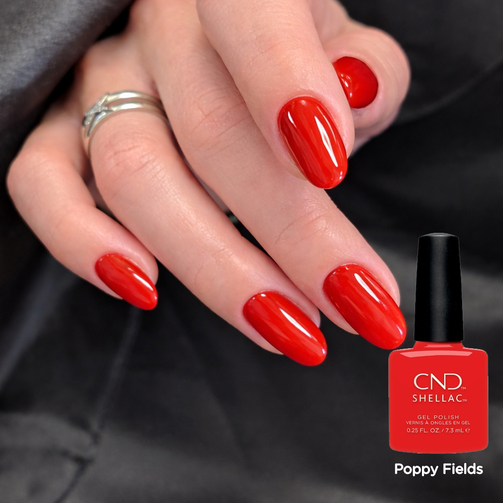Le vernis semi-permanent CND™ Shellac Poppy Fields dévoile un rouge coquelicot éclatant et chaleureux.
