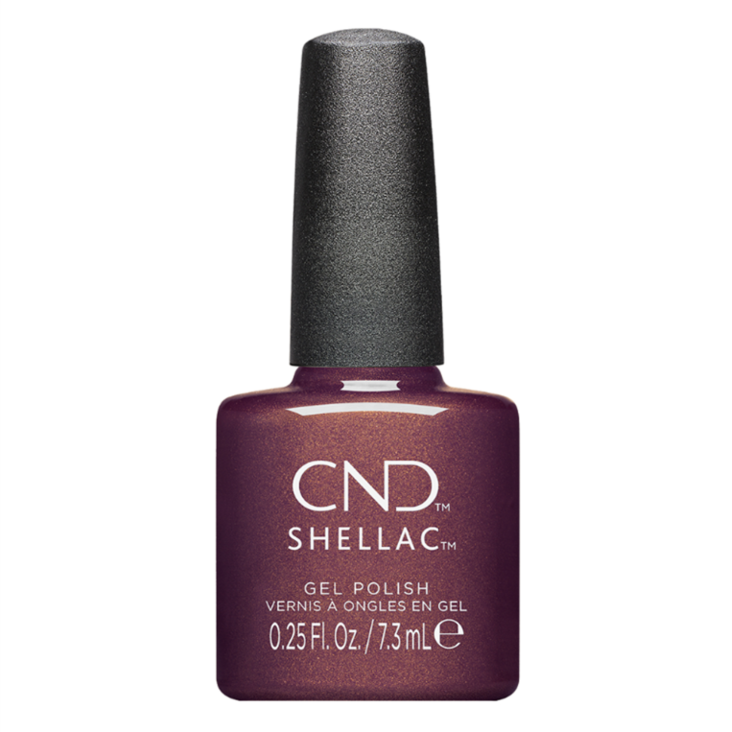 Le vernis semi-permanent professionnel CND™ Shellac Purplexity offre une teinte violette métallisée aux reflets bronze et or rosé.