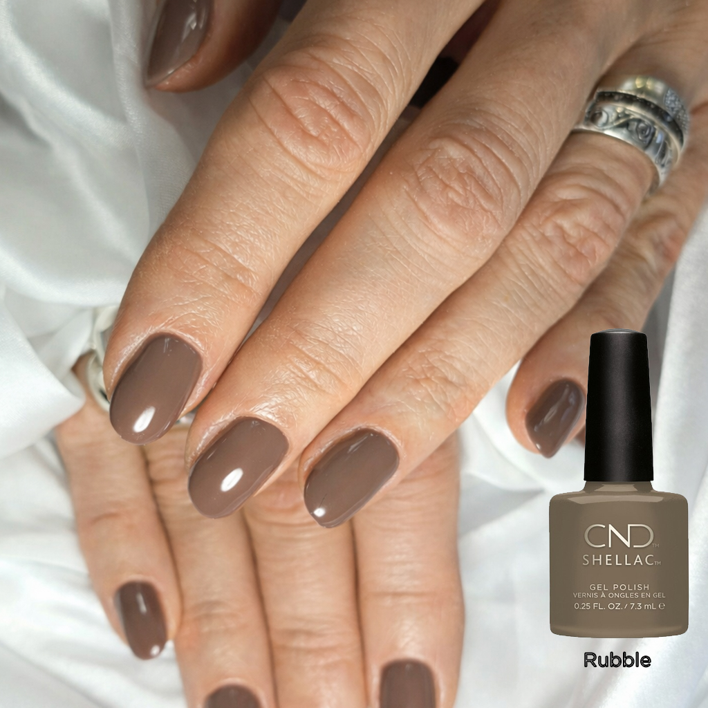 Le vernis semi-permanent CND™ Shellac Rubble dévoile un taupe profond et élégant, entre brun et gris.