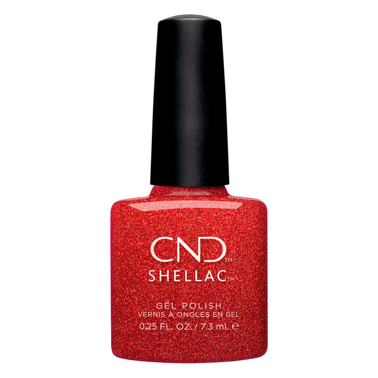 Découvrez la teinte Ruby Ritz de CND™ Shellac — un rouge rubis lumineux parsemé de fines paillettes scintillantes.