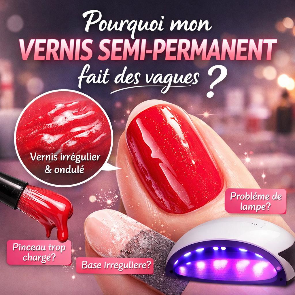 Pourquoi mon vernis semi-permanent fait des vagues ? Ce défaut visuel est très fréquent et donne un rendu irrégulier, loin du fini lisse et brillant attendu.