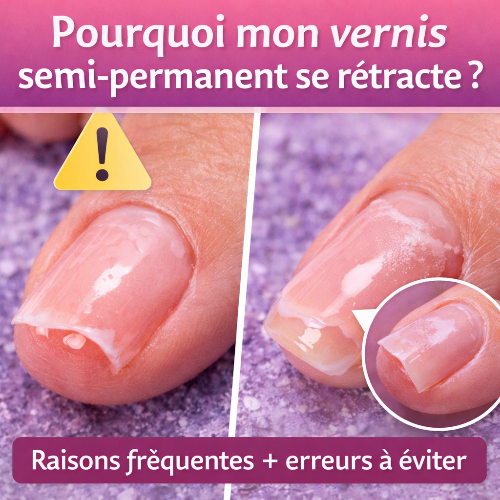 Un vernis semi-permanent se rétracte lorsqu’il n’adhère pas correctement à l’ongle. Cela peut être dû à une plaque grasse, une mauvaise préparation, une couche trop épaisse ou des produits incompatibles.